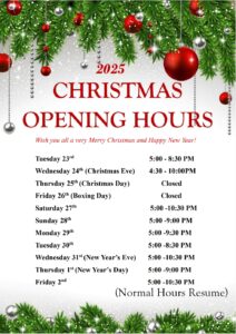 Wish you all a very Merry Christmas and Happy New Year, please find the following opening hours for this Christmas holiday!